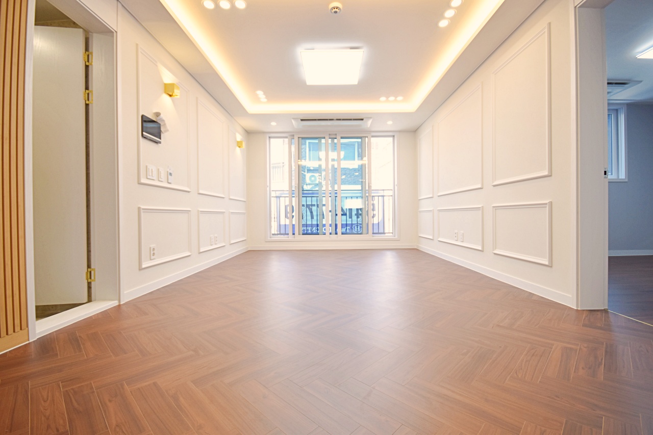 효성동신축빌라 현관을 지나 안으로 들어서면 안정적인 3베이 구조가 펼쳐지는데요, 거실과 주방이 좌우로 나뉘어 배치되어 있습니다. 두 공간 사이에는 완충 여유 공간이 있어 시야가 탁 트여 보였고, 집 전체가 보다 넓어 보이는 효과를 주었어요. 바닥은 브라운톤의 헤링본 스타일 마루로 마감되어 고급스러움이 느껴졌고, 벽면은 화이트 컬러와 웨인스코팅 마감이 조화를 이루며 차분하면서도 정갈한 분위기를 자아냈습니다. 4인용 소파를 두고도 여유 있는 폭으로 구성되어 있으며, 작전역빌라 천정에는 에어컨이 설치되어 여름철에도 시원하게 생활하실 수 있겠더라고요. 조명 역시 직부등과 보조등이 조화를 이뤄 전체적으로 아늑한 느낌이 들었습니다.