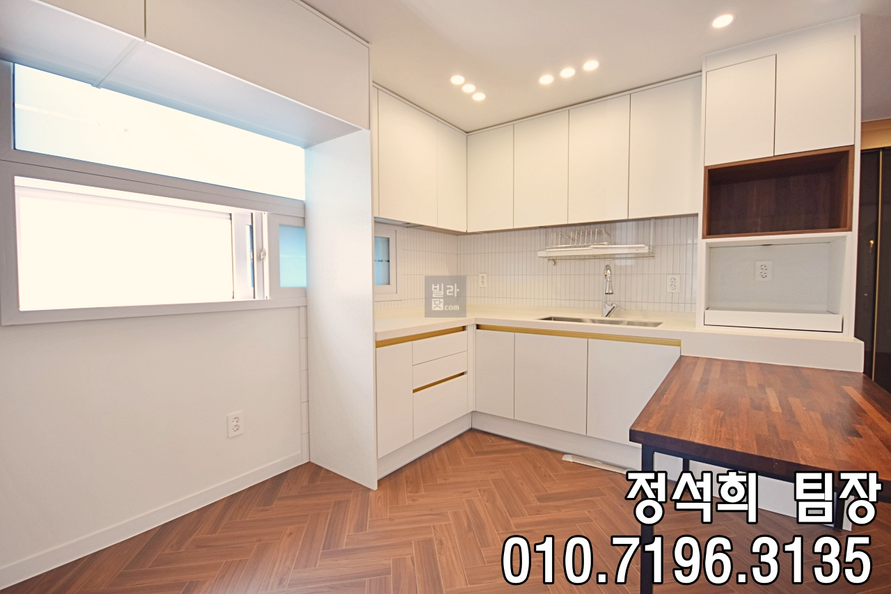 작전역신축빌라 주방은 'ㄷ자' 형태의 구조로 구성되어 있었는데요, 일하기 좋은 동선으로 설계되어 있어 주부님들이 선호하실 만한 구성입니다. 아일랜드식탁이 설치되어 있었고, 하단에 수납장 없이 편하게 앉을 수 있는 스타일로 되어 있어 가족 식사 공간으로도 무난하게 활용 가능하겠더라고요. 냉장고를 두 대 배치할 수 있는 공간도 충분히 확보되어 있었고, 밥솥과 전자렌지를 위한 별도 공간도 마련되어 있어 실용적이었습니다. 효성동빌라 주방 한쪽에는 창문이 있어 환기 또한 원활하며, 주방 가까이에 펜트리 다용도실이 연결되어 있어 보조 주방 또는 생활 수납 공간으로 다양하게 활용하실 수 있을 것 같았습니다.
